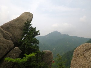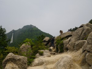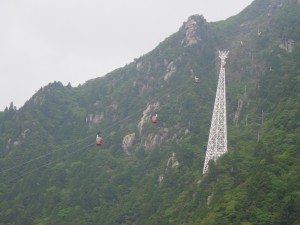 | 巨岩の開けた場所に出た | ロープウエィが動いている | 鎌ケ岳を覗く |