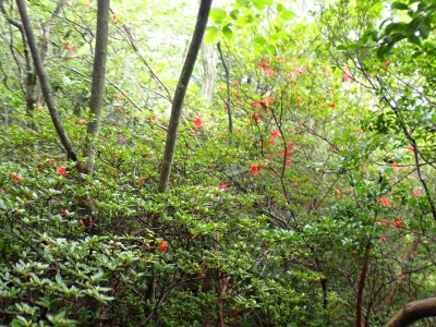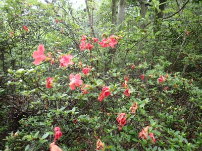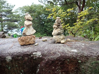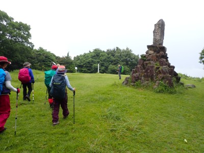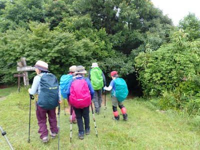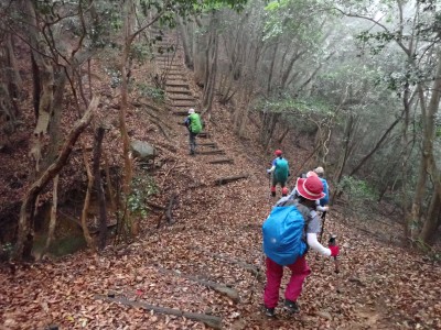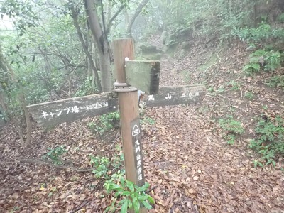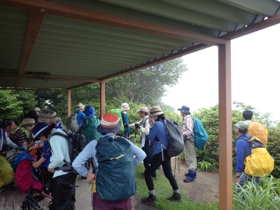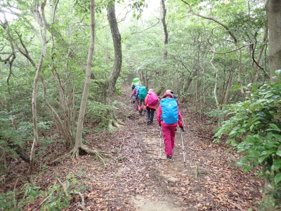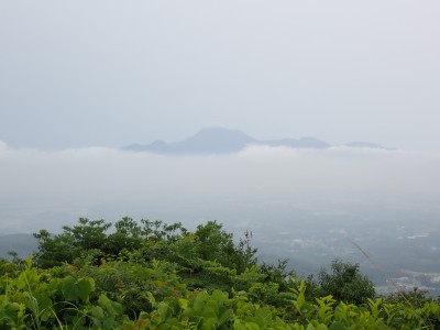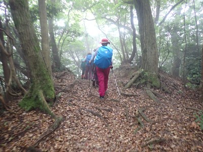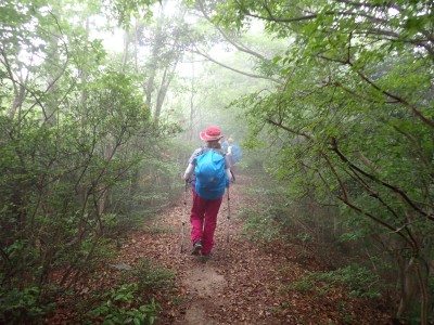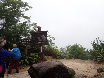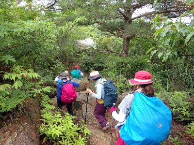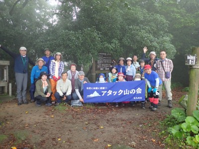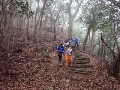 さて 梅雨の暑いときに低山を歩くとなると雨も心配だが、熱中症に注意が必要だ。そんな時期に今回何とほぼ全員の参加となった。嬉しいことだが、そうなると天気以外に悩みはもう一つ増え、移動のための車輌が4台必要となる。しかし、当会のメンバーは皆協力的ですぐに悩みは解消。そしていよいよ前日を迎える。天気予報は雨であるが、私にとって「一番都合が良い予報」を確認していると大して降らないようなので決行とした。そしていよいよ本日、登山口に着くと霧雨、雨具を着て出発するが、森の中だからか、暑いばかりで雨で濡れるよりも汗で濡れてしまうので登山開始からすぐに脱ぐことにした。(結局、下山まで雨具を再び着ることがなかった。)階段の多い登山道を経て稜線に出ると丸山、観音岳、筒ヶ岳と展望が良いはずだが、これについては今回はしょうがない。何しろ梅雨の真っ只中、雨は覚悟の上・・・・と言ってもやはり残念だ。ただ、唯一、ガスの中、雲仙岳の姿を拝めたのは、私たちの願いが通じたのではないかと思い、神々しさを感じたのは自分だけであろうか。今回は最後まで雨に打たれることはなく無事下山できたし、いつもは大勢の登山者で賑わっているはずの小岱山、今日は登山者は少なく、私たち19名が独占的に歩けたのも天気のおかげだったようだ。今日も自然に山に仲間に感謝!!
