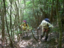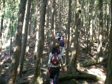 | 左は植林帯、右は自然林 | 英彦山が見える | 急登に喘ぐ |