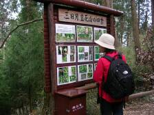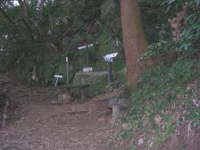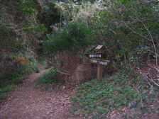 を左手に見てさらに進むと水場があり、さらにナギの大樹があります。大きなクスノキやエゴノキ、ケヤキなどの原生林となり、さらに「クスノキ原生林」との分岐(写真下・・看板がたくさんある)にぶつかります。ここで「立花山大クス」に立ち寄ります。幹周り785cm樹高30m樹齢最低300歳以上の大クスを見学し、もと来た分岐に戻ります。分岐のところには左手に屏風岩があるので見落としなく。少し急登となり「立花城古井戸」の標識を過ぎ「夫婦杉」を超え、松尾山との分岐を過ぎ、ひと登りすると「立花山」山頂です。山頂からは「海の中道」が良く見え、博多湾が一望できます。ここで一息して、さらに奥の標識「なだらかコース 下原へ」を下ります。 坂を下りきると下原からの道とで十字路になります。そのまま南へ真っ直ぐに平坦な道を行くと左で「三日月山の四季」と書いた掲示板のようなものがあります。そこには写急真集がたくさんありますので時間に余裕があれば閲覧するのも楽しいかと思います。平坦な道をさらに進むと下原からの道との分岐となりここから急登をすると三日月山の山頂です。下山は往路を引き返します。 |