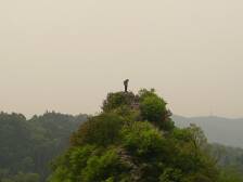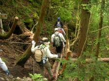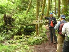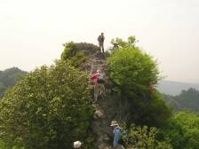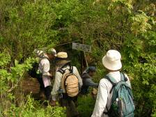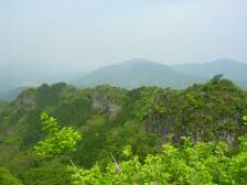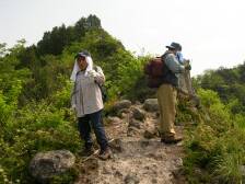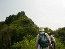 2006年5月21日 天気晴れ 今月の遊山歩会は、先月に引き続き、大分の山「田原山」となりました。別名鋸山(のこぎりやま)とも言い、岩稜歩きを楽しめます。 先月はヤセ尾根の「鹿嵐山(かならせ)」でしたが、さらにグレードアップしたと言うか ヤセ尾根続きで鎖場や三点確保の必要な場所が数多くあり、MORIさんがメンバーを鍛えてさらなる高度な山をクリアーさせようとしているのではないだろうか・・・と考えてしまったのは私だけでしょうか・・・・ とにかく断崖絶壁の山で度胸もついた山行きでありました。 <アクセス> 国道10号線を大分方面に、宇佐神宮を過ぎJR中山香駅手前の下市北交差点左手に登山道の標識がありますので左折します、そのまま進むとトンネル手前右手に登山口の駐車場があります。 <コース> 駐車場より車道を横断したところに登山口標識があります。森林の中を高度を上げ15分程度で「囲観音」への分岐標識がありますが、直進します。さらに10分ほど登ると「雫石」と言う、大きな苔生した岩があります。ここより5分程度登ると尾根にでます。一方通行と書かれた標識をみて大観峰を目指します。周りはヤセ尾根に人が蟻のように這っています。 大歓峰をよじ登り、展望を味わったら、来た道を戻りますが、一方通行なので標識どおり進みます。垂直の鎖場を下り、這うようにして岩場を行くと、大観峰から約20分で八方岳です。この八方岳がこの山の山頂です。記念撮影をしてヤセ尾根をさらに進みます。一旦下り、林の中を行き、三点支持で登ると右手に太陽石と言う男性のシンボルの形をした岩や屏風岩が見えてきます。股覗き岩(太陽石を股覗きで見ると面白い)、小松岩と続き、ヤセ尾根にもずいぶん慣れて、無明岩に到着です。今回はここで昼食です。今日は鋸山の自然を守る会の人たちがたくさん来ていて賑やかでした。昼食を終え、さらに熊野磨崖仏を見て帰ることにします。 次ページへ |