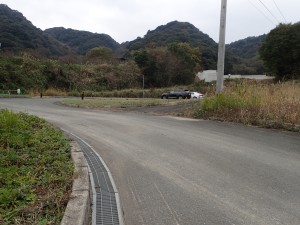 | 車道へ降りる。左に駐車スペースがある | 展望台1060mとある | 矢ノ浦池から振り返る |