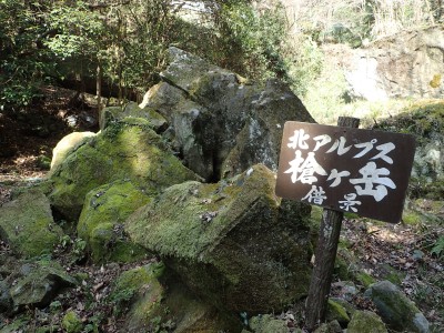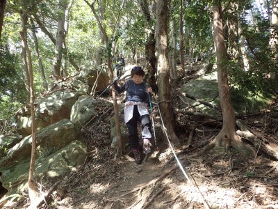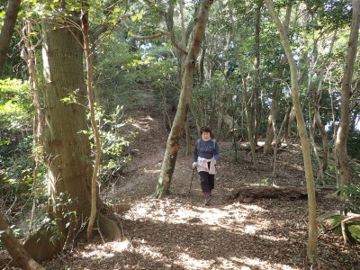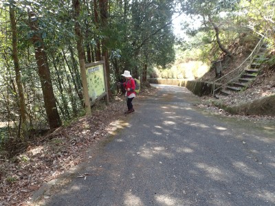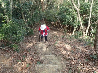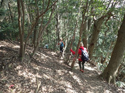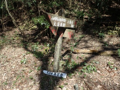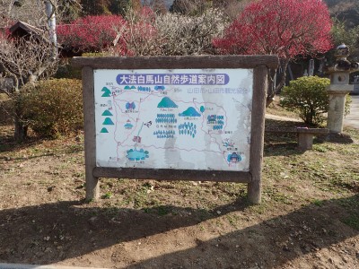 ここで反対から登ってきた賑やかなグループに逢う。写真を撮って左に降ると三叉路だが、三高山までピストンすることにした。前方に他のグループが歩き、先ほどのグループは私たちの後ろを来る。この時期、結構人気の山だとつくづく思う。三高山のピストンを終え、三叉路に戻ると今度は北へ大法山を目指す。ヌタ場を過ぎて樹林帯の尾根を歩くとピークとは思えない場所に大法山の山頂標識がある。地図を見ても稜線のちょっと盛り上がった場所で三角点でもない。なぜここを山頂としたか不思議である。道は、突然巨石群が現れて「針の耳」と名は付いていないが岩の穴をくぐり抜け、鉄橋を渡る。道はコンクリートの道でベンチも設置されている。今日は風があるのでこベンチで昼食をとる。食べていると白馬山でお会いしたグループが大法山へと通り過ぎていった。食事を終え第一展望台へ、先ほどのグループ他たくさんの人がここで昼食をとっていた。満員御礼だ。私たちは展望台で三角点の確認をしてそのまま進む。第二展望台まで来ると折り返して尾根から谷間へと下る道を探する。道標がないが壊れた道標らしきものを見つけた。地形図を見ながら降ると腰までの笹の道は階段になっているのいに気づく。すぐに立派な道標にぶつかる。谷間は歩きづらいがすぐに鬼子母神のお堂に着く。一息ついて石段を降り広い道に出ると新しい東屋がある。ここから舗装道になり、三光園の下まで来ると梅林公園への道標があるので入り込む。山腹を巻きながら公園に飛び出すと大勢の人で賑わっていた。梅の餅を買って帰りは酒蔵「寒北斗酒造」で今夜のお酒を仕入れて帰路につく。夕食は新鮮な野菜と美味しいお酒が待っていると思うと長時間の運転も気が楽になる。