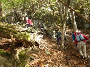 | 落ち葉の絨毯が気持ちよい | 巨木の倒木 | 岩場になる |