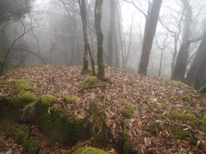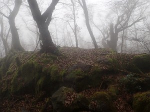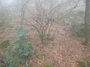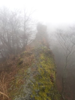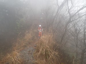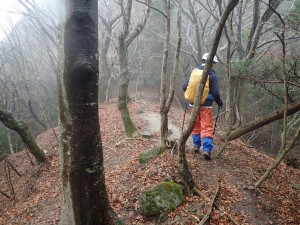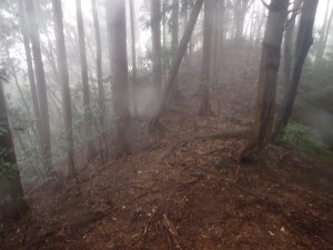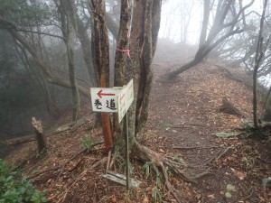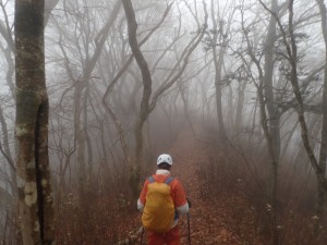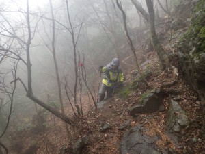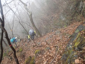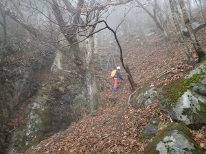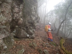 | 霧の中もなかなか雰囲気が良い | 巻き道を行く | 岩壁の下を進む |