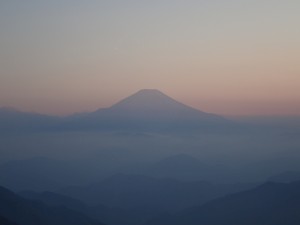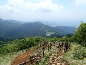 平成29年5月19日(金)天気晴れ ■出発時間:AM 5時45分 新宿の某ビジネスホテル ■メンバー:単独 「富士山満喫登山」とタイトルを付けたが、富士山に登ったわけではない。 今回の山行は、富士山のその雄大さ美しさを堪能することがテーマである。 実際に歩いてみて富士山はどこから見ても同じ形でとてつもなく大きく、存在感がある日本一の山であることを改めて感じた。 新宿から小田急線に乗る。お見合い電車は、途中から乗車する通勤や通学の人で賑やかになって乗り降りする人も多くなってきた。 秦野駅には計画よりも30分も早く着いた。外に出るとは青空が広がり、少々肌寒い。バス停には既に並んでいる人がいて皆登山者とわかる出で立ちだ。 バスの出発時間が近づくが、既に長蛇の列。早い電車に乗車して良かった。計画通りの時間であれば乗れなかったかもしれない。と思っていたら臨時便のバスが慌ててきたようにバス停に停車した。さすがバス会社も抜かりがない。 満員御礼のバスは、街から山の中へと入ってゆく。後部座席で揺れながら約1時間、終点のヤビツ峠に着く。 トイレを済ませた登山者の半分以上は、ここから大山(おおやま)を目指すようで軽装だ。 私は、他の人に追い越されながら車道を進む。皆、周りの風景や植物には興味がないようだ。 公衆トイレがある場所からコンクリートの林道に入る。登山口はすぐにある。 一旦林道を横切っていよいよ本格的な登山道になる。他の登山者で結構賑やかだ。 耳にはウグイスやホトトギスの囀りが心地よく入ってきてソウシチョウのうるさいくらいの声が聞こえないことにホッとする 登山道は良く整備されていて木道が続く。もちろん階段も多い。そのため膝には負担がかかり、もっと軽量化するべきだったと後悔する。 視界が開けてくるとまずはトウゴクミツバツツジが花を咲かせていた。九州でよく見るコバノミツバツツジよりも花が大きい。二ノ塔で休憩をして三ノ塔のピークでも休憩をして急斜面の木道を降って山荘のある烏尾山に着く。カラスの尾と言う名に親近感を抱くのはもちろん私だけだろうが名の由来はこの山で修行をしていた修験者が、修行の最中に飛来したカラスに修行成就への加護を祈念したためと言われているそうだ。 ちょうど燃料切れのようなのでここでランチタイムとした。隣で単独登山者が同じようにランチタイムをしていたので声をかけるが話は弾まない。 行者岳、新大日と進む。クサリ場もあって面白い。シロヤシオの上品な花や初めて見るマメザクラ、ツルシロカネソウの群生と花々が楽しませてくれて長い行程だが、飽きることなく歩ける。だが、気持ちは元気だが、身体はやはりきつい。 時間があれば、今日の内に塔ノ岳から丹沢山を往復しておこうかなと思ったが、とてもそんな余力はない。ガスっていることを理由に諦めることにし、計画通り明日ピストンすることにした。 ようやくの思いで塔ノ岳に着く。多くの登山者が展望を楽しんでいる。残念ながら富士山はどうも照れ屋のようでガスで隠れて姿を見せてくれない。 時間は少々早いが、山荘でチェックインをする。寝床を確認して早速缶ビールを注文。 明日の行程などを確認していると次々に登山者がやってきてそれも単独者が多い。しかも女性の単独者が多いのには驚く。 そんな中、携帯が圏外になっているので山荘の人に聞くと「窓際の角に行ってごらん」と言われ、そこにかざすと何とアンテナが見事に3本立ったのですかさず家内に電話をする。 これで一安心、それから横でビールを飲んでいた人たちと会話をするようになり、宴会が始まった。 この山荘の夕飯はカレーと決まっているが、毎日カレーを作っているわけだからとてもおいしい。しかもここは全てボッカさんが荷揚げするとのことで美味しさに感謝も加わり特別な味となる。 夕飯を食べ終わって外に出ると大画面に富士山と夕陽の素晴らしい映画の上演が始まっていた。上演が終わると再び宴会が始まり、仲良くなった山荘の人から焼酎のお湯割りをいただいたりと就寝までのわずかな時間を楽しませてくれた。そして明日の雄大な富士山を思い描き床に就いた。(翌日へ) ■コースタイム ヤビツ峠-(20分)-公衆WC-(60分)-二ノ塔-(20分)-三ノ塔-(25分)-烏尾山-(25分)-行者ケ岳-(50分)-新大日-(45分)-塔ノ岳※休憩時間含まず。全行程で5時間かかりました。 距離8.1km、標高差792m |