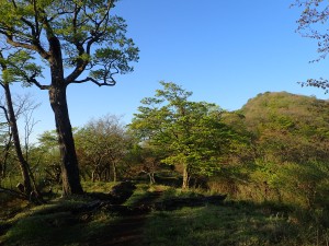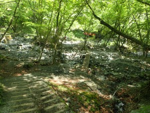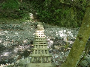 | 山腹を歩き | 木の梯子を通過 | 川原を通過 |