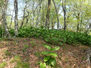 | バイケイソウの群生 | 登山度以外は歩かないように | ちょっと気持ち悪いカエデの葉 |