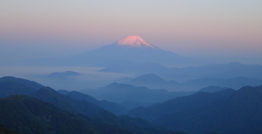 | 前日へ 午前4時、周りの音で目が覚める。結局、同じ枠で寝ていた人は、私よりも先に床に入り、先に出発したようで誰かわからないままである。 既に外は明るくなってきているのでダウンジャッケトを着て小屋から出る。 東から日の出を待つ人がたくさんいるが、私は富士山が気になる。 薄っすらと雪化粧した美しい富士山が、徐々に姿を現す太陽と共にピンク色に染まってゆく。何とも素晴らしい景色だろうか。 感動の約30分を終え、昨日、宴会を共にしたメンバーと朝食のおでんを食べる。 そしてモタモタと準備をしていたため、ろくな挨拶もできずに早々に小屋を出発することになった。 まずは、丹沢山まで往復だ。アップダウンはあるが、富士山を見ながらのきれいな縦走路でとても気持ちの良いルートだ。 丹沢山頂上には、やはり山荘がある。そこで宿泊したと思われるグループが出発準備をしていた。蛭ケ岳から来たと言う常連の方と会話して往路を戻る。 塔ノ岳への最後の登り返しはきつくてつらい道程であった。 再び塔ノ岳へ。記念写真を撮って360度の大パノラマに未練を残し、鍋割山へと降り始める。ここからは木の階段が続くので足に堪える。 富士山が時折樹木の間から姿を見せてくれるので何だか見守られてるような気分になる。「金冷シ」と言われる分岐点がある。帰宅して調べると肝を冷やす意味のようで「きんひやし」と言うことだそうだ。特に怖いところではないのだが・・・・ま、面白い名を付けるものだ。 丹沢最高峰の蛭ケ岳の堂々とした姿を見ると「あそこまで行けばよかった」とついつい欲が出てしまう。しかし、そこまでの体力は今の自分にはなさそうだ。 鍋割山に着くとたくさんの登山者が、有名な鍋やきうどんを口を尖らせながら食している。 1杯1000円なのだが、次から次へと客が来る。こりゃ荷揚げが大変だろうなと余計な心配をする。 トイレ(チップ制)を済ませ、念のためポカリを買って下山開始。多くの登山者が登ってくるため離合するのが大変だが、前にいた女性二人に助けられ(同じグループと思われて)登りの人が結構待ってくれた。そのおかげで計画通りに林道に出れた。 林道に出るともう珍しい景色も花もないので鼻唄交じりで歩く。 ゲートにぶつかると再び登山道のような道になるが、ネット(鹿避け?)をくぐって舗装道に出ると畑が広がる道に出て民家が増えてくるとレストハウス(どんぐりハウス)がある大倉のバス停に出る。ここまで来ると暑さは夏のようで汗を流してビールでも飲みたい気分だが、すぐにバスが来たので乗車した。 渋沢駅までは30分程度で着く。汗だくなのでトイレを借りて着替えを済ませ、小田原まで行き、遅い昼食をとって新横浜まで戻って新幹線に乗り込む。慌ただしく乗り込んだが、疲れが出たのか1時間ほど熟睡したようで夕方には小腹が空いて買い込んだつまみと携帯用のワインで声には出さず「乾杯!」 今回の山行では、絶景ももちろん素晴らしかったが、それにプラス山小屋で知り合った人人たちとの楽しいひと時が良い思い出となった。 今回も山に自然に地元の人にそして出会った人に感謝!もちろん留守番をしてくれた家内にも感謝!! ■コースタイム 塔ノ岳-(70分)-丹沢山-(20分)-竜ケ馬場-(45分)-塔ノ岳-(15分)-金冷シ-(24分)-二俣分岐-(3分)-鍋割山-(40分)-後沢乗越-(35分)-二俣-(70分)-大倉バス停※休憩時間含まず。全行程で約7時間でした。距離17.9km 高低差1280m |
