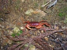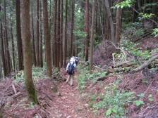 | 岩に木が・・・水場でもある | 植林帯を降る | 山めぐりさんがカニを発見! |