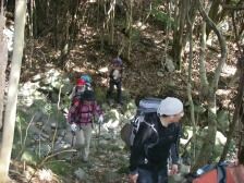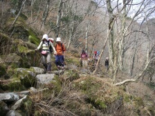 2008年3月16日 天気 晴れ 遊山歩の3月例会は私の担当と言う事で昨年行った多良岳(権現峰)から前岳への尾根歩きが素晴らしかったのでぜひ遊山歩のメンバーにもと思い企画してみた。当初中山キャンプ場からまっすぐ多良権現を目指し前岳から山際を歩き六体地蔵を経由して来た道を降る計画をしたのだが、我が遊山歩のメンバーはきっと満足しないと思い経ケ岳もと考えたが、とても時間が足りない。そこで経ケ岳はパスするも手前の中山越まで行き、金泉寺へ寄って当初予定のコースへと進むことを考えた。おかげで満足行くコースになったのではないかと思う。 <アクセス> 長崎道は武雄北方I..Cで降り、国道498号線より207号線で多良駅前の次のT字路を右折し、中山キャンプ場まで行く <コース詳細> 中山キャンプ場前の鳥居からの登山道は帰路に使うとして、行きは中山越目指し、林道(舗装道)を歩きます。道標は経ケ岳となっています。途中、ショートカットしながら自然林を楽しみ高度を上げます。45分ほどで経ケ岳と金泉寺分岐の中山越です。一息ついたら金泉寺へ進みます。勾配はここから急になります。ピークから緩やかな下りとなると大きな岩が目だってきます。マンサクも咲いていてきれいです。再び上りとなり鞍部にでると笹ケ岳への表示板があります。目の前には多良岳が見えてきました。今までは山の南側歩いてきましたがここからは北側斜面を歩きます。自然林の中、岩の多い道を気持ち良く歩き、急登すると鞍部に出ます。ここから東に尾根沿いを行っても多良岳へ行けます。そのまま真っ直ぐ5〜6分下ると金泉寺です。ここで食事とします。金泉寺では諫早市の指定文化財で木製の「不動明王及び二童子立象」、「千手観音像」があり、かなり痛んでおり、本堂や仏像の修復のため守る会が募金活動を始めているそうです。(守る会の人?から説明を受ける)また、金泉寺には山小屋があり、宿泊もできます。広場にはテーブルもありゆっくりくつろぐこともできそうです。昼食を済ませ出発です。次ページへ |
