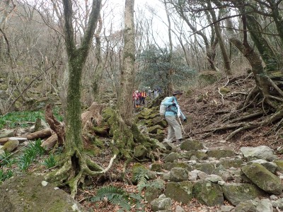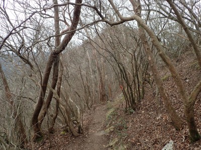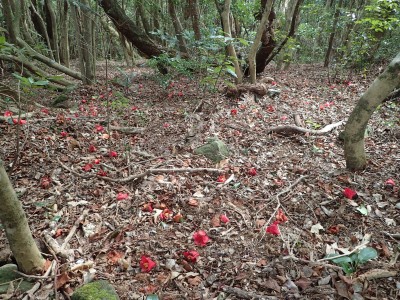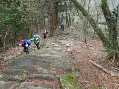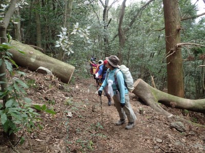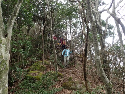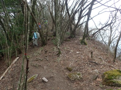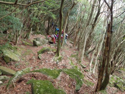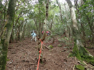 | 椿の落花の上を歩く | 急斜面にはしっかりしたロープがあって助かった | 鞍部から縦走路に出る(13:53) |