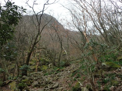 | 川原のような登山道 | 苔の岩だらけ | 頂上部が見えてきた |