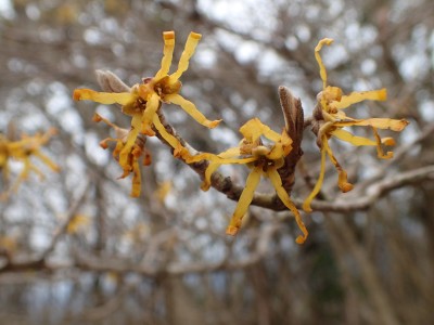 | 巨石群の間をよじ登る | 積み上げたような石 | マンサクの花 |