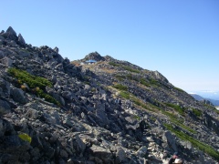 | 下を見ると小屋が小さくなってきた | 龍王岳を眺めながら一息 | 雄山神社が見えてきた |