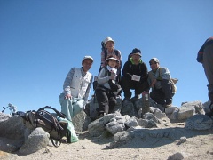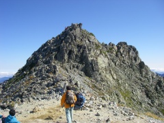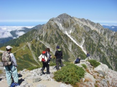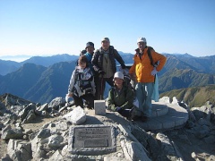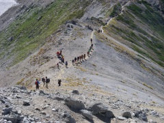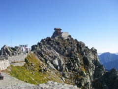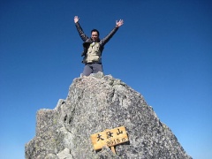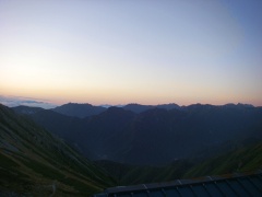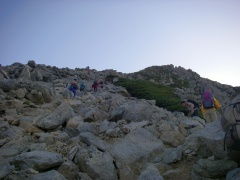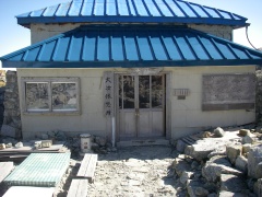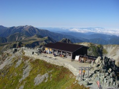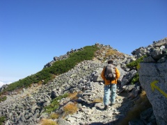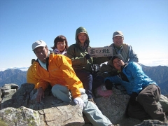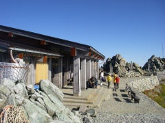 −立山連峰縦走2日目− 2009年9月20日(日) 天気 晴れ、 午前5時00分、いち早く起きてしまった私は、昨日の頭痛がすっきりとして気持のよい朝を迎えました。朝焼けを観に外へ出たりして朝食をとり(写真を撮るのを忘れたが、生卵とソーセージを蓋つきの小さな高台のついた鍋で固形燃料を使って焼いて食べるという一見豪華で焼く手間は省けるという料理が印象的だった)用を済ませ午前7時に出発しました。 <コース詳細> 一ノ越から雄山までは、最初からかなりの急登でしかもガレ場なので落石に注意です。強い風を受けながら約50分で雄山山頂です。山頂には立山雄山神社があって富士山、白山と共に日本三霊山の一つとして尊敬されてきたとのことです。せっかくなので参拝することにしました。鳥居をくぐり断崖絶壁の頂きに登ると神主さんが待ってくれています。今日は風が強く、雲を吹き飛ばしてくれ、滅多にないほど視界が開けているとのことです。富士山もくっきりと見えました。御祓いをしてもらい安全祈願をした私たちは意気揚揚と次の大汝山を目指します。尾根の西側を尾根沿いに下って稜線を上ると大汝山の山頂です。東側の足元には黒部湖が見えます。眺めを楽しんで出発です。大汝休憩所(りっぱな山小屋)を右に見て少し歩くと富士ノ折立です。ここまではほとんどアップダウンがありませんが、ここから一旦急斜面を下ります。視界を遮るものがない稜線は、歩いていて爽快です。右手(東側)に旧内蔵助山荘跡地を見て上部にある現在の内蔵助山荘を見て登りつめしばらく歩くと真砂岳に着きます。次はいよいよ別山です。内蔵助山荘への分岐をみて稜線を下ります。そしてやや上りになると目の前にガレ場の急斜面が見えてきます。両手を使いながら急登を喘ぎ、右への尾根へと斜めに登りつめます。別山北峰が見えてきます。剱岳を目の前にできる場所で、映画「点の記」の手旗信号のシーンが思い浮かばれます。次ページへ |