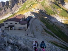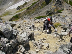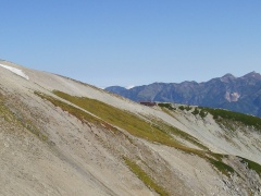 | 雪渓と旧内蔵助山荘の跡地 | 真ん中の赤い小屋が内蔵助山荘 | 緩やかな上りだが、息は荒い |