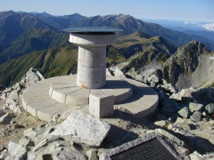 | 東を見ると黒部湖 | 大汝山 | 山頂岩場に立つ(気持ちいい) |