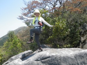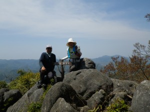 | 塔ケ峰山頂 | 天狗の舞台で踊る家内 | 展望所で記念に |