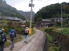 2006年11月25日 天気 くもり 遊山歩会11月の例会登山は宇佐の津波戸山(つわどさん)になりました。今年の5月の田原山の近くでもあり、奇岩絶峰でもあります。迫力満点で残り少ない紅葉も楽しめて大変面白い山でした。 いつものように「豊前おこしかけ」に6時30分に集合、2台の車に乗り合わせ国道10号線を宇佐方面へ。参加者は、MORIさん夫婦、さこちゃん夫婦、シュー左衛門さん、がしんさん、そして私たち夫婦の8名となりました。 <アクセス> 北九州地方からだと国道10号線で宇佐方面へ、JR西屋敷駅の先、左手に登山口の大きな看板があるので左折、踏切を渡り、Y字路を左に進むと右手に「津波戸山登山口駐車場」の看板があります。20台は駐車できるスペースです。 <今回のコース詳細> 登山口駐車場より案内板に従い進むとすぐに1番石仏があります。民家の中を抜け畑となり正面に津波戸山が見えてきます。道は細くなり左手に案内板があり登山口の標識があります。林の中をしばらく行くと左手に海蔵寺跡への案内板がありますが帰りに立ち寄ることにします。そのまま右手に進みます。やがてコースが分かれます。今回は左手を上り、下りに反対のコースを行くことにします。案内板には危険なケ所が書かれています。道は急登となり視界が開けてきて鎖場を行きます。無明橋のような橋もあり、スリルを楽しみながら残り少ない紅葉をみて危険なケ所もクリアしてゆきます。石仏を写真に全て納めると88枚になるので諦めます。鎖場を何度か行き一旦下ると「針の耳」に出ます。再び上り視界が開けてきます。石仏は二十番台から三十番台となり岩場を歩き林の中へ入ります。しばらく急登を行くと水月寺奥院が見えてきます。ここは飲料可能な水場があります。 <次ページへ> |