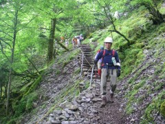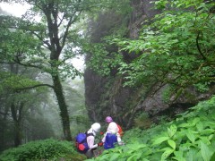 2010年8月8日(日) 天気 曇り 自然観察とボランティアの山の会の8月例会登山は、四国の剣山である。昨年は四国最高峰の石鎚山に登ったが、フェリーの旅が好評だったこともあり、今回も行き帰りはフェリーを使うことにした。メンバーは松山からの貸し切りバスの都合もあり24名と限定された。 小倉港を9時55分に出発。松山港に翌日午前5時に着く。そこからバスに乗り換え、リフト乗り場のある見ノ越には 時に着いた。 <コース詳細> 見ノ越からリフトに乗り、終点西島駅で降ります。リフトからは、キスゲやキレンゲショウマ、クガイソウなどの花々が迎えてくれました。リフトを降りると霧雨となったので雨具を着て登山開始です。当然ながらガスで眺望はあきらめるしかありません。階段状に整備された登山道をしばらく登ると広場に出ます。ここが安徳天皇が休憩したと言われる刀掛の松です。そばにその枯れた松があります。ここから左手方向へキレンゲショウマの群生している行場を目指し進みます。抜かるんだ狭い樹林帯の登山道を進みます。鹿の食害防止の柵がありますが、鹿と言いながら一番防止したいのは人間ではないでしょうか。そんなことを考えながら歩いているとトリカブトが多いことに気づきます。岩が多くなるとキレンゲショウマの群落が現れ始めました。道はどんどん下り、下りきると両剣神社です。東に一ノ森へと分かれます。一息ついて刀掛へ戻るのですが、来た道を戻るのではなく、一方通行なので前に進みます。少し下ると上り道となります。谷間にキレンゲショウマの群落を見て上りきると来た道に合流し、すぐに刀掛です。たくさんの登山者が休憩中で混雑していました。霧雨が雨に変わったため雨具を再度点検し、山頂を目指します。次ページへ |
