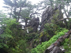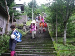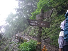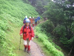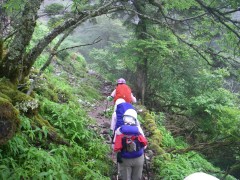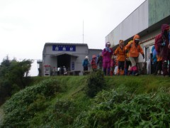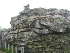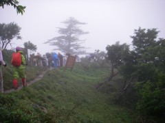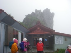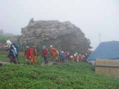 | 前ページから 刀掛の松から階段状の登山道を歩き高度を上げます。笹の道が続き、鳥居が見えてくると山頂ヒュッテです。狭い階段を上がると右手が巨岩だと気づきます。上に行くとそれが剣山本宮宝蔵石神社だとわかります。山頂にでているのですがガスで周りの景色は見えません。三角点は、これから南にあるそうなので木道を歩きます。木道がUターンする地点に三角点が祭られていました。木道のベンチで昼食を済ませ集合写真を撮って早々と下山です。山頂ヒュッテから鳥居をくぐると道が分かれます。下りは大剣神社へと進みます。御塔岩と言う奇岩があってその下に神社がありました。さらに下ると日本名水百選の御神水があり、他の登山者が口を潤していました。石灰岩の多い狭い登山道はやがて歩きやすくなり木の鳥居をくぐると西島駅です。トイレ休憩をして出発です。リフトには乗らず、見ノ越まで歩きます。急坂を下ると道は平坦となり、リフトの下のトンネルをくぐり下ると剣神社です。簡易宿泊所もあります。剣神社の参道を降りてお土産屋さんの通りをリフト乗り場へ戻ると出発地点です。 <参考コースタイム> 見ノ越-(リフトで15分)-西島駅-(15分)-刀掛の松-(30分)-両剣神社-(35分)-刀掛の松-(30分)-山頂-(30分)-大剣神社-(30分)-西島駅-(40分)-剣神社(見ノ越) ※休憩時間は含まれていません。全行程で約4.5時間でした。 <おまけ> 剣山登山を終え、祖谷のかずら橋と琵琶の滝に立ち寄りました。結構面白かったです。それから秘境の湯で汗を流し、松山港へと向かいますが、バス内から見えた花火も最後のおまけとなりました。もちろんフェリー内では反省会と言いながら酒宴で締めくくりました。 |