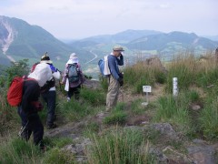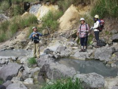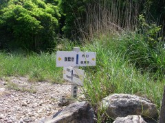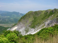2009年5月23日 天気晴れ 1週間前に予定していた今回の山行は、雨天のため今日に延期となった。今回の山は、鶴見岳の北へ連なる山々である。以前、塚原温泉から内山、鶴見岳と縦走したが、その時は雨で泥だらけになった記憶がある。今回は天気もよさそうで展望も楽しめそうだ。参加者はMORIさん夫妻、豊津の信ちゃん&俊ちゃん、そして私たち夫婦の6名である。いつもの豊前おこしかけにAM7時に集合、途中別府湾SAでトイレ休憩を済ませ、鍋山温泉郷の登山口に着いたのは8時15分。準備をして登山開始となった。 <アクセス> 別府ICより右折してやまなみハイウエイを明礬温泉へと向かいます。坊主地獄手前の信号を左折、安心院方面へ行くと明礬温泉ですが、えびす屋の先のカーブを左折します。(へびん湯の案内板があります)道は砂利道となり、とにかく上に進むと「鍋山温泉郷」と書かれた門柱がある駐車スペースに着きます。(ここからは行き止まり) <コース詳細> 行きどまりの林道を少し歩くと硫黄の匂いでここがカラス湯かとすぐにわかります。道から右手に泥湯があり、道沿いには祠があってすぐに透明な湯があります。登山道はこの先を進みます。森の中へと入って行きますがすぐに石のごろごろした谷間を行くことになります。左方向の支尾根に取り付くと道は険しくなり稜線まじかでなだらかな勾配となり、そのまま突き進むと目の前が開けた縦走路に飛び出ます。右(北)をみると伽藍岳、左(南)を見ると内山です。まずは、伽藍岳を目指します。南に歩き、すぐに塚原越です。(登山口から右方向に進むとここに出るらしい)道は広く車が通れそうです。しばらく行くと広場のようなところから細い登山道となります。西峰への分岐標識を見て真っ直ぐ進むと山頂に出ます。 (次ページへ) |