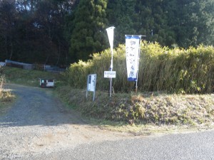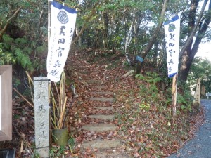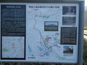 | 大谷登山口まで舗装道を歩く | 黒田官兵衛の旗が目印 | 説明板がいたるところにある |