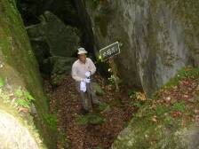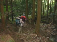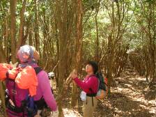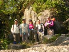 前ページからの続き 宇土浦越より再び上りとなり、正面よりやや右手に屏山が見えます。屏山までは左手(南方)のピーク(860m)を経由して行きますが、このピークは麓でショートカットできますので10分程度の時間短縮が可能です。緩やかな上りから急登となり宇土浦越から約50分で屏山山頂です。山頂は北側の展望のみです。今回はここで反対側から登ってきたYさんと合流しました。そして遅い食事です。屏山より古処山までは割と緩やかな稜線歩きです。ツゲの原生林が多くなり、岩が増えて急登となり、「奥の院、大将隠し」の標識があります。せっかくですから立ち寄ります。(往復20分見ておけば良いでしょう)記念撮影をして再び標識まで戻り、古処山に向って岩の中を歩きます。目の前に巨岩が現れ、上に立つと360度の大パノラマを味わうことができます。さらに少し行くと石祠などが祭られている山頂広場に到着です。下山は古処キャンプ場へと下ります。山頂広場の西側奥の北側に進むと石仏が数体ある城跡にでます。ここを通り過ぎ下ってゆくと秋月との分岐を見て北に植林帯を下り川原を下り、緩やかな杉林を行くとコンクリートの林道に出ます。林道を10分程度歩くと防除柵があり、遊人の杜キャンプ場に出ます。少し下り右に行くとトイレを過ぎて駐車場に着きます。 <参考コースタイム> 宮小路−(10分)−登山口−(45分)−林道−(50分)−御神所岩−(15分)−馬見山山頂−(40分)−宇土浦越−(50分)−屏山山頂−(40分)−古処山山頂−(40分)−林道−(15分)−キャンプ場駐車場 ※休憩は含んでいません。あくまでも参考時間です。(全行程で約7時間〜8時間) <感想> かなりロングランなコースです。馬見山までは倒木で少々荒れ気味です。途中、コースがわかりにくいところもありました。花は期待していなかったのですが、初めてのシギンカラマツという花にも出会えて大満足です。(「シキンカラマツ」ではなく「シギンカラマツ」です) |
