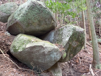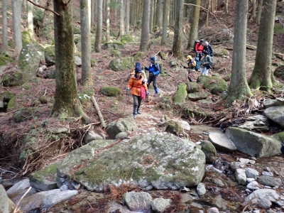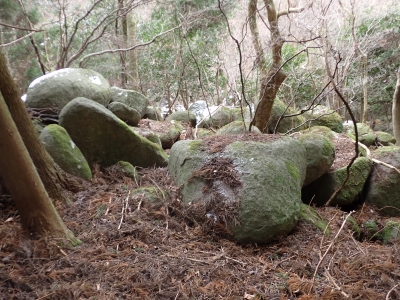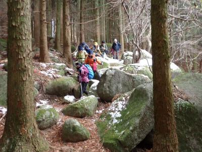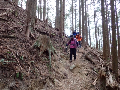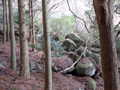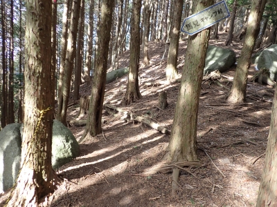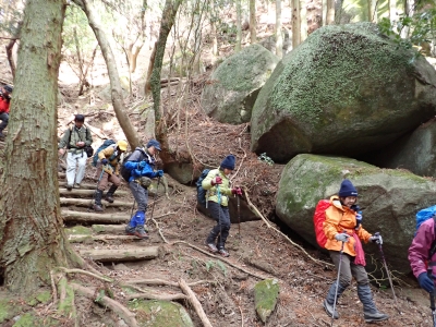 | 谷間は丸味のある巨石がたくさんある | 寄り添い岩(9:30) | 植林帯の急斜面を進む | |