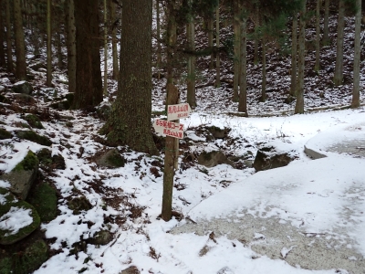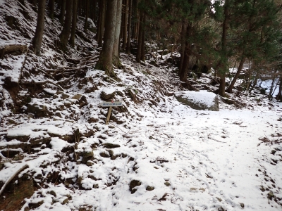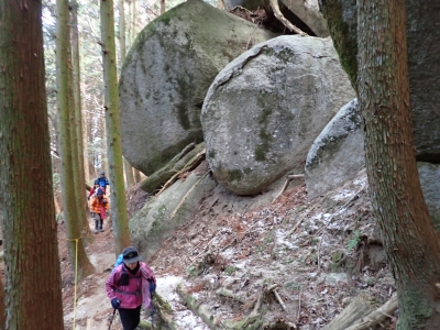 | 林道に出るとアイゼンを脱着(14:10) | ここからは往路を戻る | 巨石群を縫うように | |