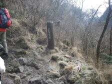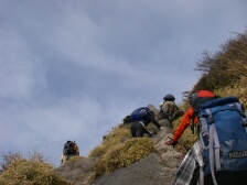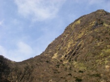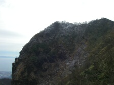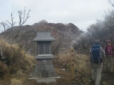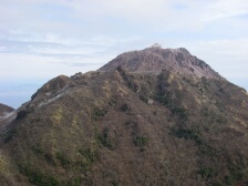 | 前ページからの続き 下り坂から平坦な尾根道を行くと普賢岳と国見岳の分岐があります。まずは左手国見岳へと進みます。すぐに急斜面が見えてきます。ロープがかかった急峻な岩場を慎重に登ります。コース一番の難所です。普賢岳分岐標識より10分程度で国見岳山頂です。あまり広くないのですが360度の展望で普賢岳も良く見えます。今回はここで昼食としました。寒いときは暖かい物に限ります。おでんやうどんなどの食事です。食事を済ませ、いよいよ普賢岳を目指します。来た道を下りますが、岩場は慎重に降ります。分岐標識で普賢岳の方へ進みます。道は下り、振り返ると国見岳の急斜面が見えます。下りきると平坦な道となり、すぐに紅葉茶屋に出ます。茶屋と名がつきますが実際にお店があるわけではありません。(もしかして昔あったのかも)20分程度急登に喘ぐと普賢岳神社と書かれた木柱とお賽銭口とかかれた石の社(やしろ)がある広場に出ます。目の前には平成新山があります。右手の岩場をひとのぼりすると普賢岳山頂です。展望は360度で岩場の広い山頂です。下山は紅葉茶屋まで戻り、南側のあざみ谷へと下ります。自然林の気持ちの良いコースです。山頂から30分程度であざみ谷です。次ページへ |