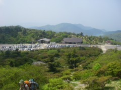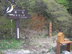 2009年4月29日 天気晴れ 自然観察とボランティアの山の会の6月例会登山は長崎の雲仙岳となっている。今日はその下見ということだが、今日から高速代がETCを利用すると1000円になる。そしてGWの初日でもある。それとは関係なしに人気があるのか、いつもよりも下見希望者が多く車2台で行くことになった。幸い高速代は気にしなくて良いが、混雑が予測される。午前6時30分メンバーのHさんの会社に集合し出発。サービスエリアは大混雑したものの九州縦貫道は大した混雑もなく抜けた。途中有田の陶器市のため有田ICで降りる車が渋滞していたが、我々は横を見ながら通過した。途中、近道がありそうなので確かめに行くがバスが無理そうなので引き返したりして池ノ原園地に着いたのは午前10時30分だった。今回は参加者12名での山行である。 <アクセス> 九州自動車道の長崎道は諫早I.Cで降りて国道57号線を雲仙方面へ、道は小浜温泉より内陸部へ上り道となり温泉街を抜けゴルフ場手前で池の原園地へ左折する。右手に妙見登山駐車場がある。 <コース詳細> 駐車場の奥にトイレがあるが、そのそばに仁田峠への標識があります。公園の中を少し歩くと右手に弘法大使と書かれた鳥居が見えてきます。道は石段となりしばらく単調な上りとなります。駐車場から約35分で広い駐車場がある仁田峠に出ます。売店や露店、トイレがあります。登山道は今歩いて来た道の真正面あたりにあります。ちょうどロープウェイに沿って歩く事になります。この辺りに雲仙ツツジことミヤマキリシマがあります。高度をあげると下の景色も最高で今来た駐車場やゴルフ場が小さく見えてきます。40分程度喘ぐとロープウェイの発着所に着きます。現在ここに妙見岳の山頂標識がありました。一息ついて駅舎の奥に展望台への標識があるので上がって見ます。途中左手に鳥居がありますが、妙見神社への参道のようです。右に上がると展望台です。普賢岳、平成新山が目の前に見えます。(次ページへ) |