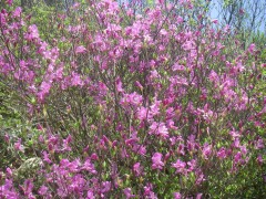 | 仁田峠駐車場を振り返る | ミツバツツジが見ごろ | 鴛鴦ノ池(オシドリノイケ)か? |