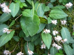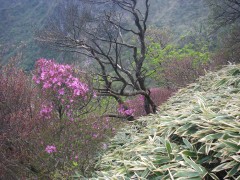 | 普賢岳目指し一旦降る | 国見岳の露岩した斜面 | ハルトラノオの群生 |