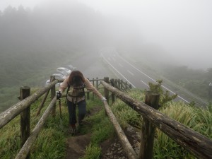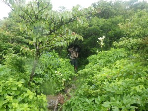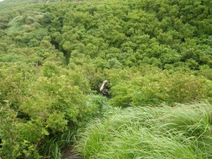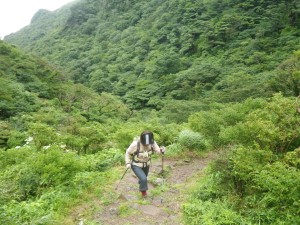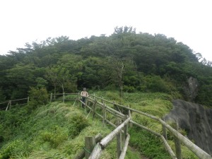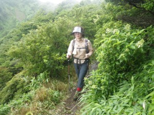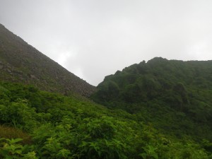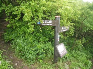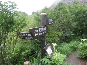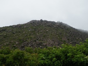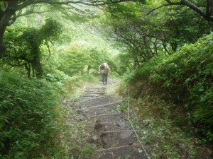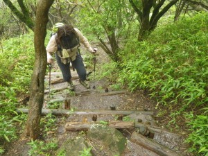 前ページからの続き -------普賢岳------- 九千部岳登山口から国見岳登山口でもある第二吹越駐車場に移動する。朝来た時には1台も車がなかったのに、もう5台も停まっている。車を降りると娘と同世代の若い女性2人が登山準備をしていて声をかけられる。(正直嬉しいもんだ)九千部岳を行くか、普賢岳に行くか迷っているとのこと。地元の方のようで初めてではないとのことだ。結局天候を心配してか、九千部岳へと歩いて行った。(後で思えば正解) 私たちはガスの中、普賢岳目指し歩き始めた。駐車場から木の手すりのある階段を上がるとトンネルの上部を横断し、尾根に取り付く。ここから厳しい上りが始まる。霧雨だったが、やがて雨足が強くなってきたので傘をさす。上から一人の女性が下山してきた。足元が悪いから気を付けてとのこと。足元に注意しながら歩くが、家内は、バテ気味だ。標高は高いが、湿度が高い上にこの急勾配。立ち止まる回数が増え、雨も止みそうにないので思い切って下山することも考えた。しかし、コンビニで買った助六寿司を立ちながら食べるとずいぶんと元気が出たようでしかも食べ終わる頃には雨も止んだ。周りを見るとホトトギスの花がたくさん咲いていて和やかな気分にさせてくれた。急斜面は未だ未だ続くが、ゆっくりと時間をかけて登る。 12時35分、駐車場から1時間15分かけて妙見岳と国見岳の縦走路である吹越分かれに出合う。目の前に普賢岳が見えると『やっぱり来て良かったね』と家内と口を揃えたように声を交わす。私は、ここからはそんなに厳しいルートではないと思うと気持がかなり楽になる。今日は時間と体力を考え、国見岳はパス。急斜面の下を見ると鞍部にカラフルな出でたちの団体さんが小さく見える。皆、カッパを来ているようだ。この暑さでカッパを着るのはちょっときつい。私たちもゆっくりと降りきる。アジサイとハナウドの花に迎えられ幸せな気分だ。鬼人谷口では先ほどの団体さんが昼食を楽しんでいた。私たちはここから新ルート(途中までは旧登山道を整備)を歩く。ちょうど普賢岳と国見岳の谷間を北に向かう。少し歩いたところで何だか湯気のような煙が立ちこめている。近づくと冷たい風が岩の間から出ているではないか、手を当てるととても冷たい。自然のクーラーだ。平坦な道は抜かるんでいるが歩きやすい。 13時10分、西の風穴で雲の切れ間から見える島原湾を眺めながら今度はベンチに座ってランチタイムをとる。風穴からの冷気で食べ終わる頃には、濡れた体が冷えて少々寒い。ここで男性1人に追い越され、また2人の男の子を連れた男性が、追いついて来た。北の風穴から数分で鳩穴分かれだが、ここからもガスってなければ展望が良いようでとても残念である。道は方向を変え、急登となる。登りきって開けると景色は一変して平成新山の赤い石の山積みが現れる。歩いている道は、緑で覆われていて不思議な景観である。立岩の峰展望所と書かれている場所で記念写真を撮ってこの不思議な景観の中を道標に沿って歩く。 14時6分、普賢岳が目の前に見える立岩の峰に着く。平成新山と普賢岳の谷間を降って上り返す。山頂まで250mの道標は霧氷沢へとの分岐にのようだが、ここでまたもや雨が降り出した。しかもかなり強い雨となったので急いで普賢岳山頂を目指す。 14時28分、普賢岳山頂に到着。しかし、土砂降りの雨の中、雷も鳴り出したため即下山開始。紅葉茶屋へと降る。川のようになった登山道を急ぎながらしかも滑らないように降る。 14時50分、無事仁田峠との分岐地点の紅葉茶屋に着く。紅葉茶屋と言っても茶屋があるわけではない。(昔はあったのかも)雨は止んだが、雷の音は聞こえてくる。靴の中はジャボジャボと水が入って体もびしょ濡れだが、暑さで逆に気持ち良く感じさえもする。鬼人谷口はすぐでここから往路を戻る。暑さのため、かなり体力を消耗し、国見分かれまでの登り返しは、かなりきつかった。 15時20分、吹越分かれに着く。休む暇なく尾根を降る。木の丸太が崩れていてとても歩きにくい。整備していただいた方々には申し訳ないが、こうなると本当に障害物だ。かえって危険である。目の前に九千部岳が雲の切れ間から姿を見せてくれた。ここからの九千部岳は恰好が良い。 16時08分、第二吹越駐車場にヨレヨレ状態で無事下山。せっかく雲仙まで来たので温泉に立ち寄る計画ではあったが、時間もないので駐車場で着替えをして家路に着く。かなり疲れた山行であったが、この天候にも関わらず無事下山できたこと山に自然に感謝感謝。 ■コースタイム 第二吹越P-(60分)-吹越分かれ-(10分)-国見分かれ-(15分)-鬼人谷口-(10分)-西の風穴-(17分)-北の風穴-(5分)-鳩穴分かれ-(16分)-立岩の峰(10分)-霧氷沢分かれ-(12分)-普賢岳山頂-(23分)-紅葉茶屋-(22分)-国見分かれ-(7分)-吹越分かれ-(50分)-第二吹越P ※休憩時間は含くまれていません。全行程で約5時間でした。 |