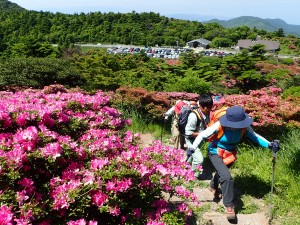 平成29年5月28日(日) 天気晴れ ■出発時間:午前6時30分(北九州市小倉南区下曽根付近) ■メンバー:男性5名、女性6名 計11名) 日帰り登山で行ける山となると片道3時間が限界ではないかと思うが、今回は4時間近く必要だ。それでも山行計画に入れたのは、個人山行で5年前に歩いた新ルートがすごく良かったからだ。しかも九重よりも早くミヤマキリシマが開花するのでタイミング的にはそれも期待できる。 仁田峠には、一方通行でしかも8時過ぎないとゲートが開かない。早く来た登山者は仁田峠よりも標高の低い池の原園地駐車場から歩くしかない。しかし、我々は遅出なので気にせずゲートで100円払って混雑する駐車場に車を停める。観光客で既に賑わう中を歩き始める。ミヤマキリシマは例年よりも早く開花したのか、既に満開を過ぎて株によっては花が終わるものもあった。しかし、高度を上げるにつれ真っ盛りの状態で妙見岳付近からの国見岳は見事にピンク色に染まっていた。 その国見岳は登らず、谷間へと降り、紅葉茶屋でランチタイムとした。 新ルートは、ほとんどのメンバーが初体験なので風穴の冷風を楽しんだり、国見岳の形の変化に驚いたり、そして急登を終えると溶岩ドームが目の前に現れ、わずかだが噴煙を上げているのを見て火山活動を感じる。窪地のような普賢岳と平成新山の間をわざと遠回りするかのように歩き、霧氷沢へと立ち寄る。そこには思わぬサプイライズ。何とヒカゲツツジがひっそりと群生していた。(場所は既に公開されていた) 普賢岳頂上は、大勢の人で賑わっていて写真を撮るのも順番待ちである。しばらく展望を味わって紅葉茶屋を経由し、紅葉がきれいだと思われる薊谷を歩き、終点のロープウェイ駅に無事下山する。皆、満足顔なので本当に良かった。今日も自然に山に仲間に感謝! ■コースタイム 仁田峠P-(45分)-妙見岳-(35分)-紅葉茶屋-(50分)-立岩の峰-(10分)-霧氷沢-(15分)-普賢岳頂上-(35分)-紅葉茶屋-(45分)-仁田峠P※休憩時間は含くまれていません。全行程で約5時間分でした。距離6.24km、標高差312m |