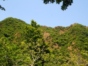 | 国見岳から伸びる稜線 | 北穴(12:21) | 谷間の上の山腹を巻きながら歩く |