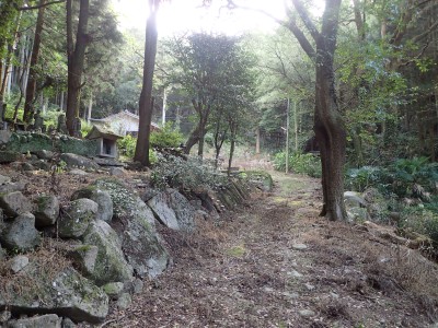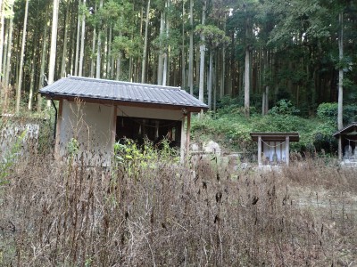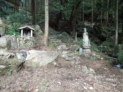車を停め、出発。道は参道のように石段になっているが、あまり人が歩いていないようだ。小屋のような物が見えて枯れ草で覆われた敷地の周りに不動明王などの石像が並んでいる。少々不気味だ。
