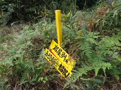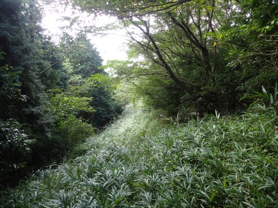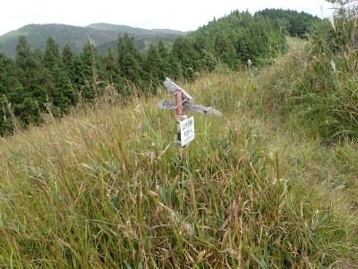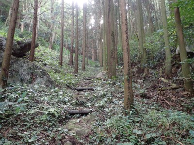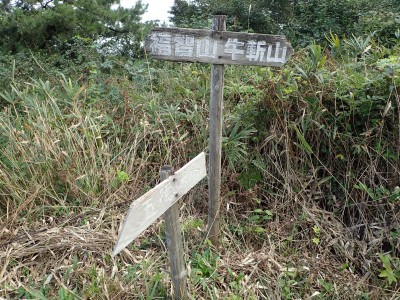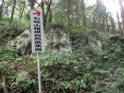 その奥に道が続いていて鳥居をくぐると「石鎚山権現自然散策路」と道標がある。そのまま進むと巨石群が目に入る。道はあまりはっきりしないが、矢印の道標があるので迷うことはないだろうが、倒木でわかりづらい所もある。林道に出て登山口を探す。道標があるものと予想していたが、結局、道標らしき物はなく、テープとしっかりとした踏み跡がある場所より入り込む。尾根道は、登山道としてしっかりとしていて歩きやすい。笹の防火帯に出ると道は不明瞭になるが、とにかくこれを真っ直ぐ行けば稜線に出るはずである。