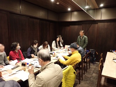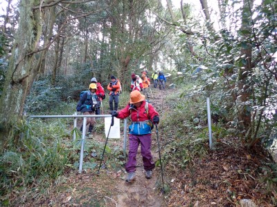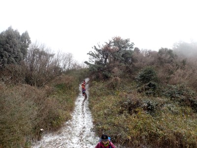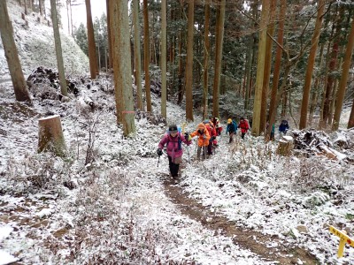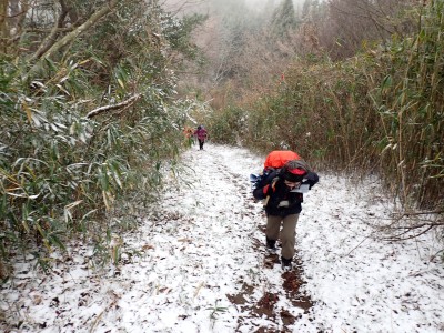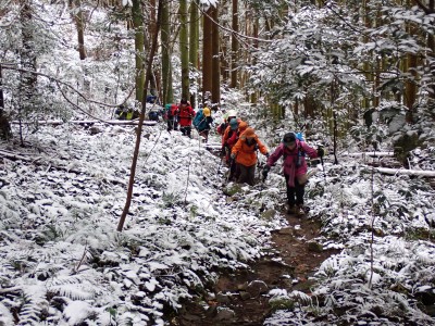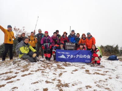 いよいよ今年最後の例会登山となったアタック山の会。下山後の総会と忘年会を一度に行うことになったため例年より忙しい。何しろ決算処理と資料作成が、年末の仕事(主に挨拶回り)と重なるわけだから尋常じゃない。それでも何とか間に合わせた。忙しいと余計なこと(例えば悲しいこと)は考えずに済むので精神的には健康でいられるかもしれない。ただ、ミスがないように注意が必要だ。さて天気が心配である。急に寒波が来て積雪や凍結が予想された。今回はJRを利用するので電車が運行中止にならなければと、それこそ「未明」から確認をしていたので寝不足で自宅前からバスに乗る。JR城野駅からはメンバーと一緒になり車窓から見える雪景色に嬉しくもあり、不安もありで採銅所駅に到着。予想外に積雪は全くなく、ただ吹雪いて寒い。林道を終え登山道に入ると雪化粧した森がとてもきれいだ。途中で若い男女が降ってきたので声をかけると「山頂まで登ったが吹雪いていたので早々に下山してきた」とのこと未だ初心者のようで一緒に付いてくると言うことになった。ま、危険箇所もないので良いだろう。頂上に着くと残念ながらガスで視界は効かず、それでも集合写真は満面の笑顔だ。山頂から福智山への縦走路に出て牛斬峠に気づかずに五徳峠へ降り始める。斜面は濡れて滑りやすく予想以上に時間を消費する。五徳峠に到着すると香春岳への登山口から少し入り込んだ広い場所でランチタイム。予定時間をオーバーしているため今日はここから下山することにした。そうなると総会まで余裕があるが、早めに小倉駅に到着してコーヒータイム。予約していた宴会場で総会をさせていただきそのまま忘年会へと突入。(お店の気遣いには感謝)当然ながら話は尽きない。今年は割と天候に恵まれたが夏の暑さは年々厳しくなってきていることを感じる。来年は春と秋にたくさん山行を楽しめたらなと思い頑張って企画しようと決意する。