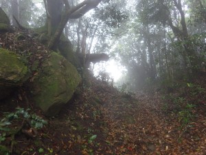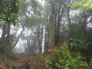2015年4月19日(日) 天気 曇り ■出発時間:6時頃(道の駅山之口) ■メンバー:単独 昨日の鰐塚山は、空は霞んでいたが天候はまずまずで目的のイワザクラの花も見れてとても満足ゆく山行であった。そして温泉に浸かり道の駅で宿泊したわけだが、この時期にしては暖かく、全く寒い思いはせずに過ごせた。しかし、道の駅は深夜でも車の往来があり遠慮のない声もしておかげで朝方になって熟睡してしまい目が覚めると既に5時半となっていた。 もちろん文句を言うつもりはない。それが道の駅である。 幸い、心配していた雨は未だ降っておらず、簡単な朝食を済ませ目的地の牛ノ峠登山口へと向かう。 途中、コンビニへ立ち寄り国道から地方道47号線33号線12号線と進み安藤ストアー手前より左折して民家を抜け川沿いに走るが、途中から離合も困難な細い砂利道となってこれが約4Km続く。たかが4kmだが、対向車に注意してなおかつ底をつかないようにゆっくりと慎重な運転となるのでどうしても時間もかかるし、何しろ神経を使うので疲れる。 正直、よくもこの山を九州百名山にしたもんだと文句を言いたくなるくらいであるが、それが嫌なら歩けば良いということでもあるので横着なことは絶対に言えない。 ようやく通行止めのロープが見えた。横には小屋が建っている。 雨は今にも降りそうなので手際よく支度をして出発だ。 しばらく地図を見ながら林道を歩く。ここからの道は舗装されていて車でも快適に行けそうであるが・・・。 左にカーブする場所に「水源かん養保安林」の標柱があって反対側に登山口がある。 ここから本格的な尾根の登山道となる。 ずいぶんとえぐれた道は昔から人の往来があったのではないだろうか。地形図の牛ノ峠は旧街道上にある。その旧街道は現在通行できないようで途中で入り口らしきところはあったが、藪となっていた。 一旦、工事中の場所に出て再び尾根歩きが続く、、きれいな自然林の尾根で気持ちが良い。 途中で一度だけ開けた場所から旧街道の牛ノ峠方面が見える。 目の前が明るくなると鞍部らしき場所に出るが左手に従是東飫肥領(これよりひがしをびりょう)と刻まれた石柱がある。ここが牛ノ峠論所跡と言う場所らしい。論所とは境界争いがあった場所のことを言うらしい。帰宅して調べたら三股町のウェブサイトに掲載されていた。 ここから山頂までは5分であるが、もっと長く感じる。息を切らせて開けた場所に飛び出る。 大きなコンクリート製?の丸柱(正確には丸ではないが)があるので方位盤かなと思ってよく見ると何と「天測点」と書かれている。これも後で調べると昭和26年〜33年に全国で48点設置されたらしい。天測点と言うと星を観測した場所となるが、この山に申し訳ないが「こんな場所に?・・・」である。当時はどうやってここまで来たのだろうか・・・・・・。 山頂は樹林に囲まれ展望はない。もっとも霧雨で視界が利かないので開けていても同じであるが・・・・。下山は往路を戻る。ここまで来てもったいない気持ちもあるが帰路に着く。 この二日間、山に自然に感謝!! ■参考コースタイム 林道P-(20分)-登山口-(40分)-山頂-(25分)-登山口-(15分)−林道P※休憩時間含まず。全行程で約2時間でした。 |