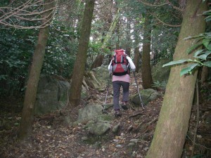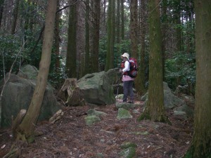 | ここまで戻り、ここから若杉山へ | 暗い杉林を歩く | 石が増えてきた |