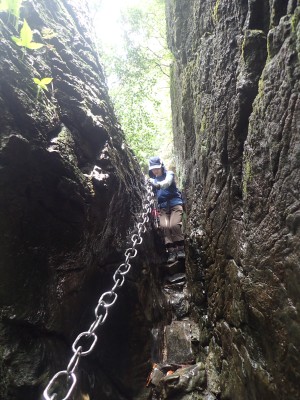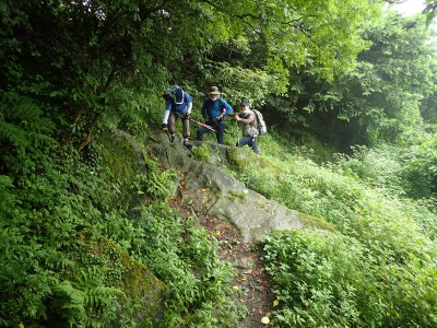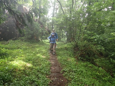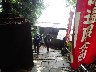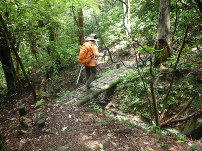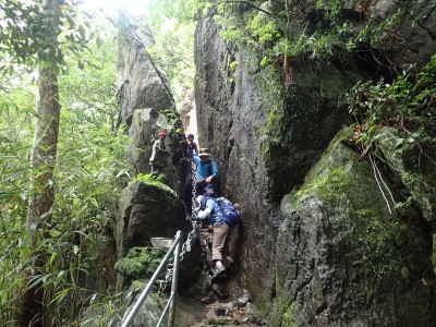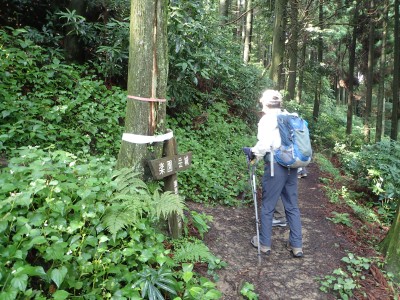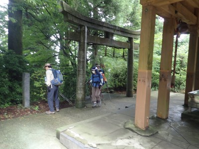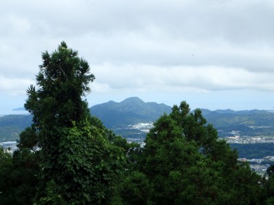 キャンプ場は昨日の雨にも関わらず、大勢のキャンパーがテントやタープを張って楽しんでいる。登山準備をして車道を歩き、まずは岳城山へと進む。森の中はとても涼しく快適だ。岳城山の頂上からは北側の展望が開けている。一旦降り展望所へ立ち寄る。ここからは西側の展望が開けていて福岡市の街が見渡せる。眺めを楽しんで往路をしばらく戻り、分岐点より若杉山へと歩を進める。サラシナショウマやホトトギスなどが目に入る。杉林を抜けると道は結構険しくなり木のチップが敷かれた林道に飛び出る。再び登山道に入り655.6mの三角点がある場所を見て平坦になると太祖宮に出る。参拝者で賑わっているかと思っていたがほとんど人はいない。奥ノ院へと巨石をくぐりハサミ岩をクリアして奥ノ院へ到着。お参りをして入口とは反対側の石段を上がる。階段はきつい。山頂はそのまま通過し、若杉ケ鼻へ。岩の上に立つとなぜか気持ち良い。霞んでいるが眺めも良い。狭いので長居は禁物、他の登山者のためにも早々に撤収。往路を山頂まで戻る。ここで昼食だ。昼食もそれぞれ離れて陣取る。そのため大きな声を出さないと声が聞こえないのでいつもより静かな昼食となる。『もうコロナに慣れたもんだ。』とつくづく思う。