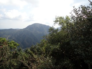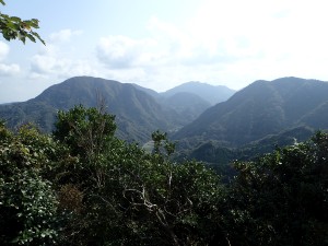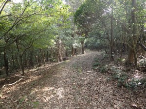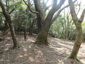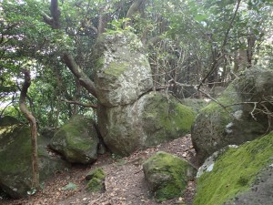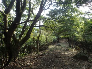 | 登山口の道標 | 樹林の中を歩く | 巨樹も多い |