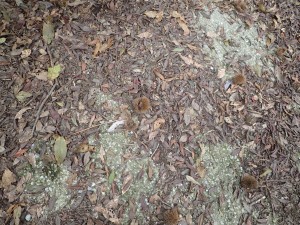 | 鳥居まで戻った(13:17) | 登山口まで戻った(13:33) | 栗だ! |