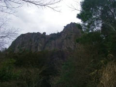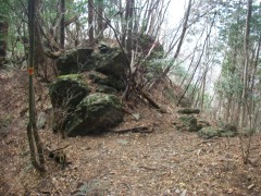 | 前ページから 山頂でゆくりっと食事を済ませ下山ですが、今日の見どころカニのハサミ岩を見て下ります。山頂より来た道を少し戻り、分岐より山ノ神へ降ります。檜の植林帯から小さな谷へ出てしばらく行くと前方にカニのハサミ岩が見えてきます。飛び出た岩に立ち乗ると良く見えます。ジグザクの道から再び植林帯に入り真っ直ぐな谷間を下りきると林道に出ます。林道を右にひたすら歩くと登山口に出ます。途中、カニのハサミ岩が見える場所があります。 <参考コースタイム> 矢谷登山口-(50分)-穴川分岐-(50分)-山頂-(30分)-カニのハサミ岩が良く見える飛び出た岩-(40分)-林道-(35分)-矢谷登山口 ※全行程で約4.5時間でした。(あくまでも参考時間です) <感想> 上りのコースは、沢沿いで自然林の中、気持ちの良い素晴らしいコースでしたが、下山の植林帯は、単調でさらに林道歩きも長いので少々飽きてしまいました。しかし、何よりもカニのハサミ岩を正面で見れる場所や林道から見上げることができるのでこのコースは必須です。それと歩く距離は短いものの、登山口までの移動が大変だと感じました。特に宿ケ峰尾峠から意外と遠く、カーブがとにかく多い道なので車酔いにも注意です。一泊で国見山とセットにすると良いかも知れません。 |