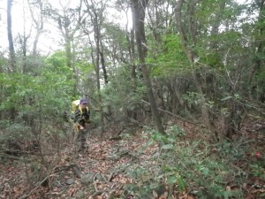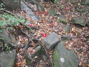 | きつい斜面が続く | 潅木帯になったようだ | ツバキの花がたくさん落ちていた |