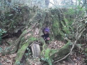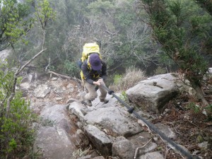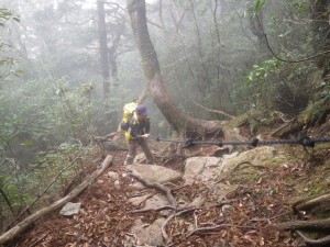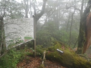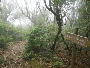 2014年4月19日(土) 天気 曇り後雨 ■出発時間:午前7時45分(自宅) ■メンバー:SUMさんとカラス 二度目の屋久島山行は九州百名山(「九州百名山地図帳」山と渓谷社)である三座を歩く予定であった。「あった」と表現したのはそれを達成することができなかったからである。 「どうせ屋久島はいつも雨だから」・・・・と天候は下り坂であったが、船や宿の予約もあったので予定通り出発した。 しかし、屋久島がいくら雨が多いからと言って本降りの雨の中を歩くのは危険も伴うし、景色を楽しむ余裕などなくなる。せっかくなら雨は雨でも時折青空がみえるくらいの天候に歩きたい。 初日は、愛子岳、往復6時間の行程で予想通り上りも下りもきつかった。 登山口前には5〜6台停められそうな駐車スペースがあって先客が1台停まっていた。 登山口から緩やかな道は、いつも見慣れた風景で特に屋久島に来たと言う感じがしない。 そんなことをSUMさんと話をしながらいつのまにか緩やかだった道は急登となって巨木が現れてきた。階層別植生図が要所にあって植生や標高を確認しながら歩ける。 「しるべの木」とある大きな切り株は、このきつくて長い登りを一時楽しませてくれた。 やがてロープ場に出ると岩場が続く。「垂直に近い岩壁」があると情報を得ていたので確保用のザイルを準備していたが、設置されていたロープがしっかりしていたので苦労することもなく安心して登れた。木も何もないザレ場に出る。滑ると危険であるが周りがガスっているせいか高度感もなく恐怖感もない。 晴れていれば、山頂からの絶景を楽しめたことであろうが、愛子様はお許しくださらなかった。私の長女も同名なので身近に感じていたのだが・・・・。 下山は、雨も降り初めたこともあり、落ち葉に隠れた木の根に何度も足を滑らせた。そのためSUMさんは膝を痛めてしまった。 他の登山者はと言うと、2名途中で私たちが追い越しそして1名の男性に追い越される。下山時には、元気な女性が登って来られたので声をかけると地元の人だと言う。 標高差1000mは、さすがにきつかったが、山頂付近の岩場は醍醐味があって晴れていればきっと景色も素晴らしいのであろう。 無事下山し、明日のモッチョウム岳付近へと移動する。途中で尾之間温泉で汗を流し、食料を買出ししてキャンプをする。ところが・・・・・・翌日へ <コースタイム> 登山口-(80分)-標高600m-(50分)-しるべの木-(20分)-標高1000m-(60分)-山頂-(50分)-標高1000m-(45分)-標高600m-(60分)-登山口※休憩時間含まず。全行程で約6時間半でした。 |