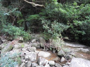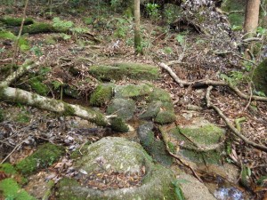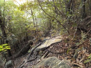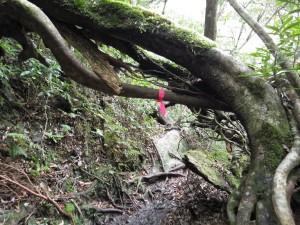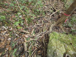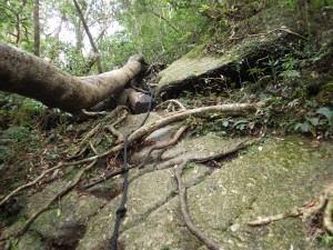 | ロープを補助に登る | ヘビのような木の根は滑る | 少し下って沢を横断する |